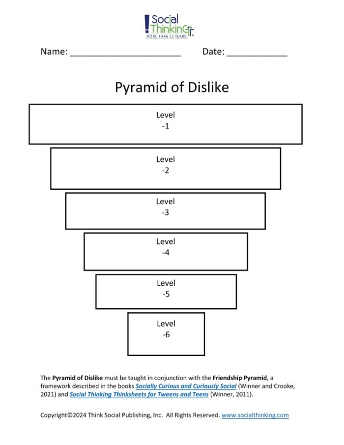 So this past week we developed the Pyramid of Dislike. Download the blank Pyramid of Dislike handout—but don’t teach it until you’ve taught the Friendship Pyramid. Learn about the Friendship Pyramid in our popular book Socially Curious and Curiously Social: A Social Thinking Guidebook for Bright Teens and Young Adults.